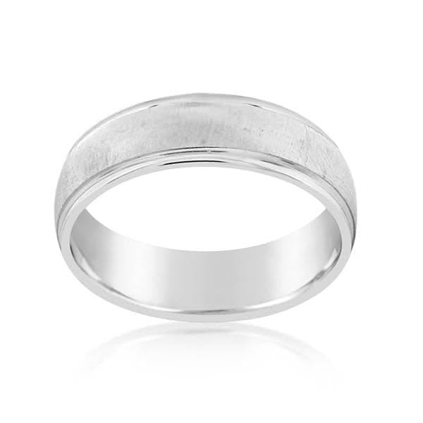 14K white gold comfort fit wedding band with a satin engraved center. The band is 6.5mm wide. Special order sizes available. Pricing may vary with size of ring.