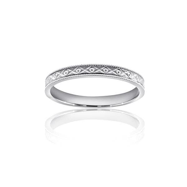 14K white gold comfort fit wedding band with an engraved center from the Reis-Nichols Collection. The band is 2.5mm wide. Special order sizes also available. Pricing may vary with size of ring. Visit either our Indianapolis/Fashion Mall Commons or Greenwood store to view our entire collection of over 1,000 men's wedding bands.
